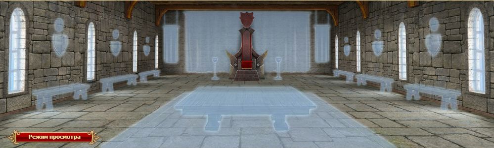 В настоящий момент вы можете украсить свой Тронный зал такими элементами, как различные витражи, скамьи и лавки, гобелены, светильники, канделябры, столы, ковры, бочки, вымпелы, щиты, топоры и мечи.