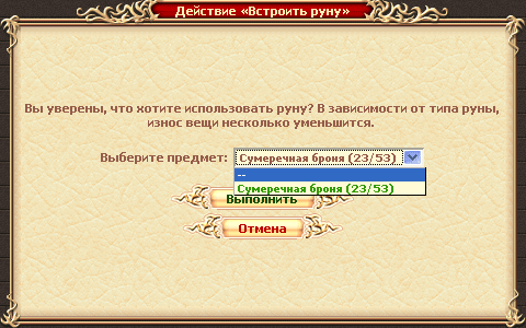 Если же такой предмет имеется, появится окно, в котором можно выбрать предмет для встраивания в него руны. После просто нажмите "Выполнить", и руна будет встроена.