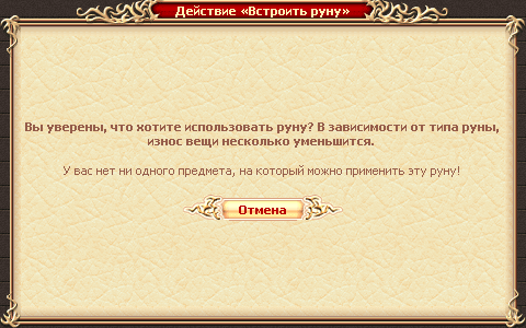 Если в вашем рюкзаке нет предмета, в который может быть встроена руна, появится следующее сообщение: