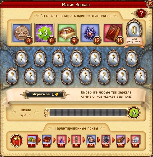 Внимание! Каждая игра, независимо от полученного приза, увеличивает счетчик гарантированных призов и шкалу удачи на 1.